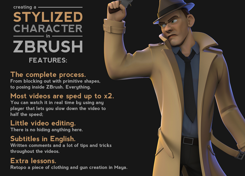 - The complete process of creating a stylized character from blocking out with primitive shapes up to posing inside ZBrush. It's more than 7 hours of training;